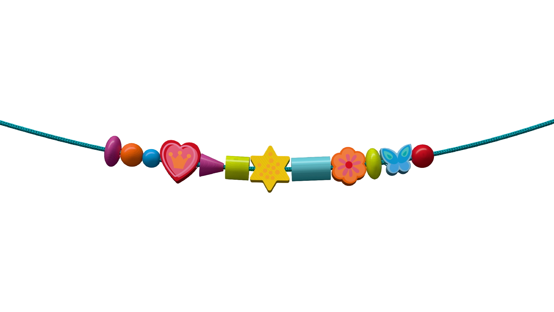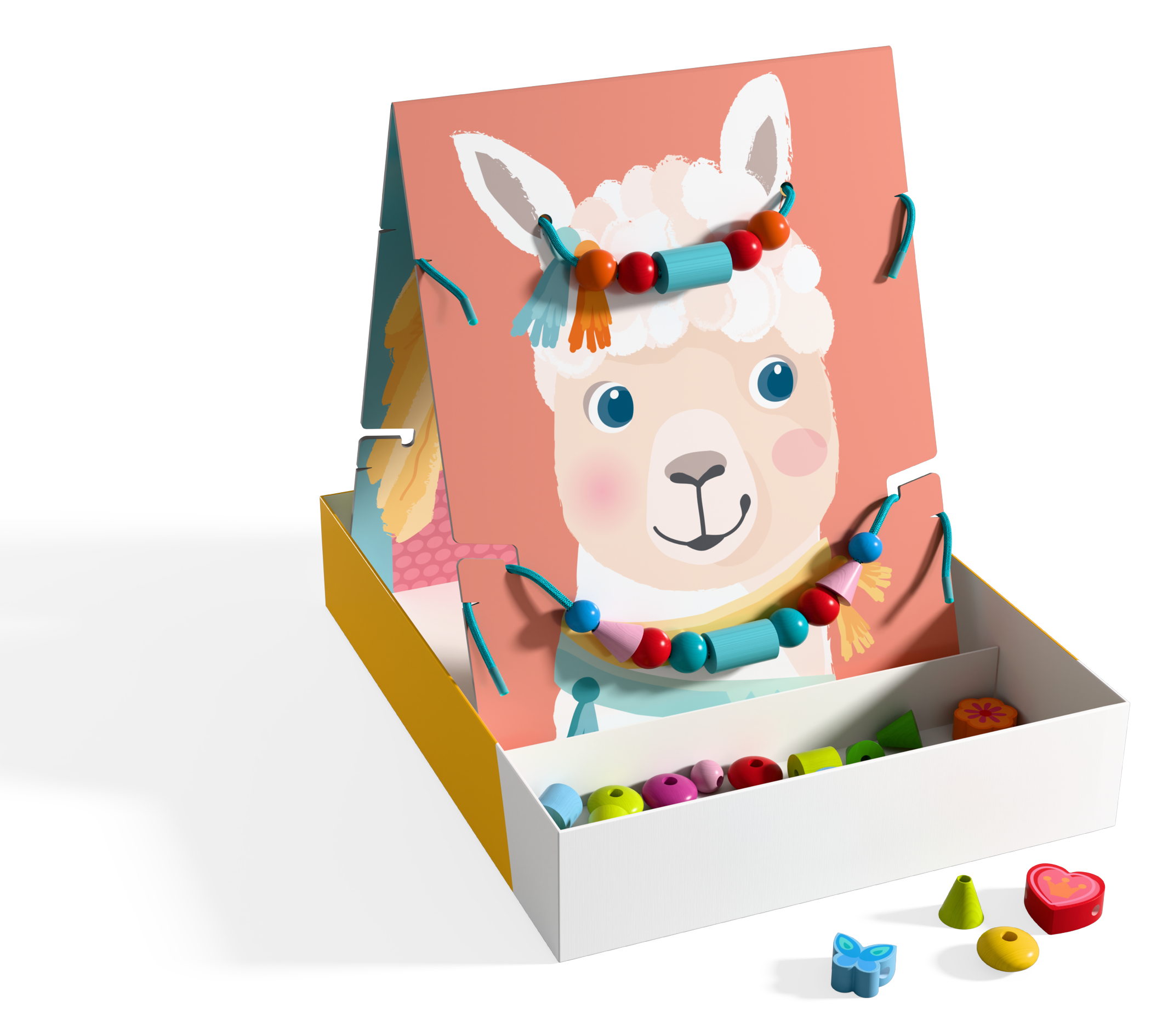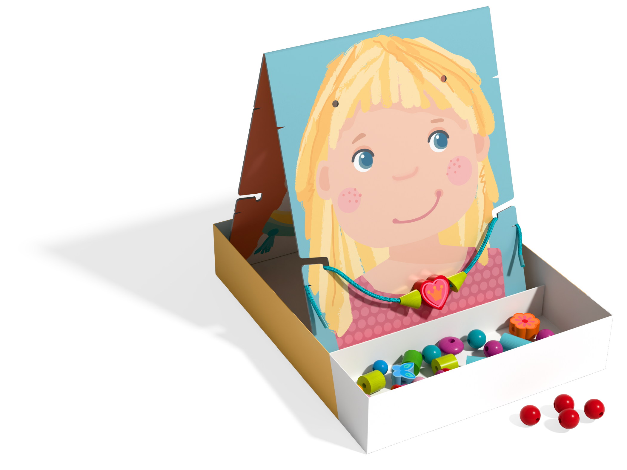 Wer bekommt eine neue Kette oder Stirnband: Bär, Lama oder doch eines der beiden Kinder? Die Entscheidung dürfen kleine Fädelfans ab 3 Jahren selbst treffen. Einfach den Aufsteller anhand des gewünschten Motivs ausrichten und standsicher in die Verpackung platzieren. Perlen, Sterne und Co. dürfen jetzt nach Vorgabe oder nach Lust und Laune auf die Schnur gefädelt werden. Anschließend einfach am Aufsteller einhängen – fertig ist das neue Schmuckstück!
