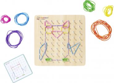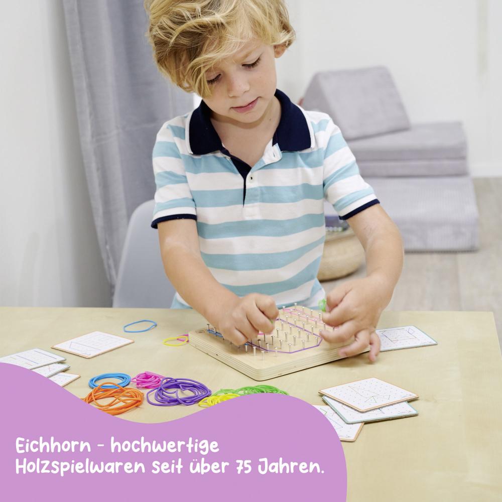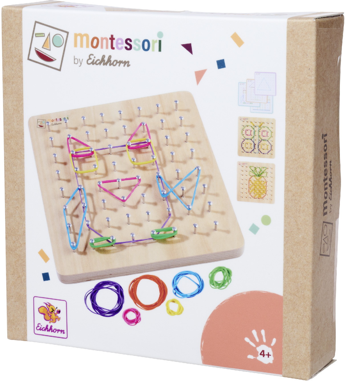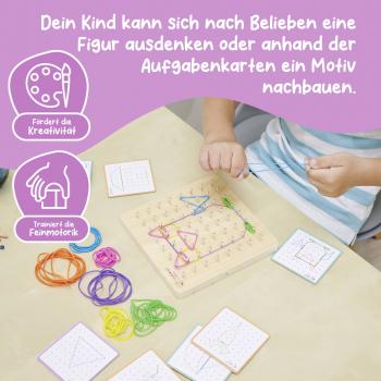 Das Montessori Geometrie Board mit 64 Nägeln und 30 farbigen Gummis ist ein tolles Set zur Förderung der Feinmotorik und Kreativität. Dein Kind kann sich nach Belieben eine Figur ausdenken oder anhand der 48 Aufgabenkarten mit verschiedenen Schwierigkeitslevel ein Motiv nachbauen. Das Geometriebrett ist praktisch und kann überall mitgenommen werden – ob im Auto, ins Restaurant oder zu einem Freund - ein idealer Reisebegleiter. Das 18x18cm große Montessori Geobrett besteht aus 100% FSC zertifiziertem Lindensperrholz und ist für Kinder ab 4 Jahren geeignet.