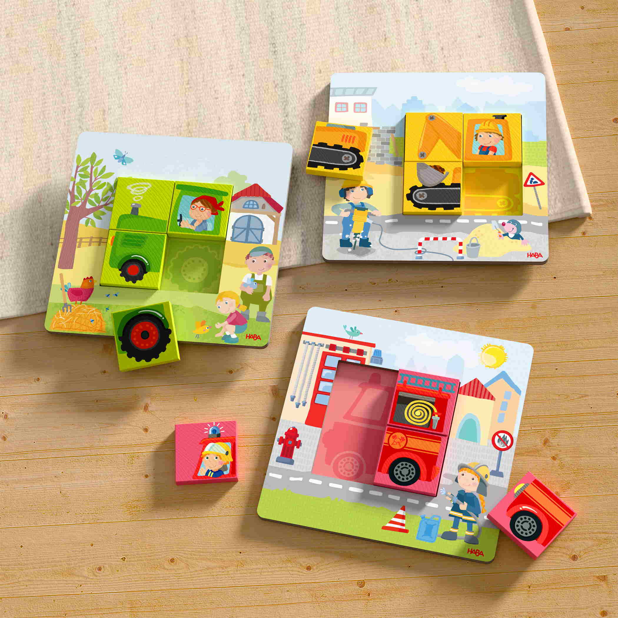 Das erste eigene Feuerwehrauto selbst zusammenbauen und der passenden Spielwelt zuordnen? Na klar! Und dann gleich noch einen Traktor oder Bagger hinterher. Ob nach Vorlage platziert oder wild durcheinander gelegt – so entfaltet sich die Kreativität kleiner Legekünstler auf spielerische Weise.