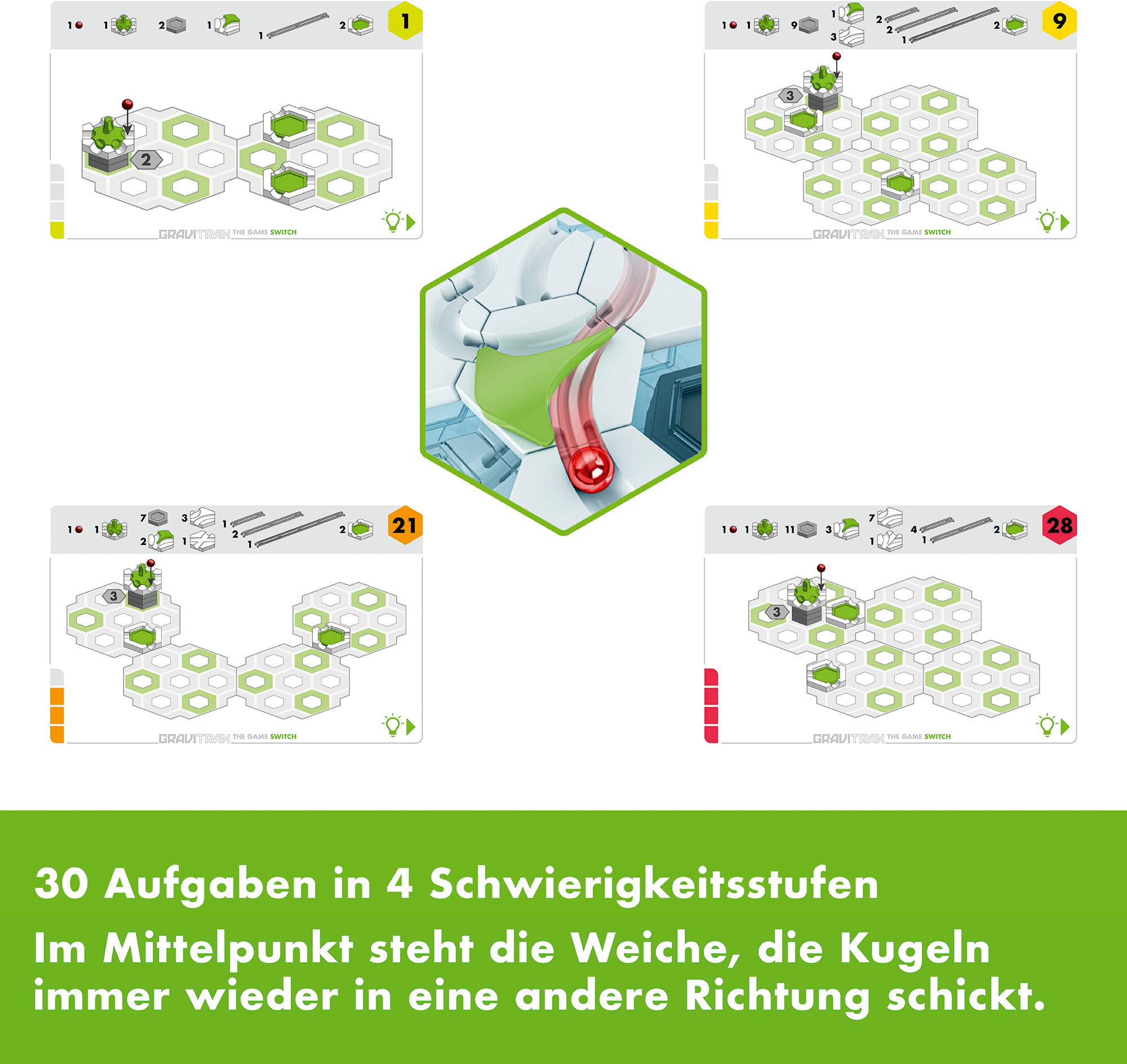 The Game Switch besteht aus 30 Rätseln, die mithilfe von Aufgabenkarten gelöst werden. Die Position vom Startstein und beiden Zielen ist angegeben. Wie muss die Bahn gebaut werden, dass die Kugel vom Start bis ins Ziel rollt? Es wird vorgegeben welche Elemente verwendet werden dürfen. Erreicht die Kugel beide Ziele, ist die Aufgabe gelöst. In diesem Set stehen 3 Weichen und 2 Ziele im Mittelpunkt. Insgesamt 39 Bausteine bringen Kinder bei The Game Switch zum Knobeln.