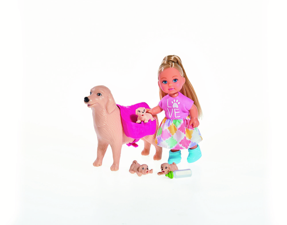 Evi kümmert sich liebvoll um ihre Hündin, die vor Kurzem Mama von drei süßen Welpen geworden ist. Wenn sie die Hundematte auf dem Rücken ihrer Hündin festschnallt finden dort in der Seitentasche alle drei kleinen Hündchen Platz. Mit der Trinkflasche kann Evi der Hündin auch noch beim Füttern der Kleinen helfen. Für Kinder ab 3 Jahren geeignet.