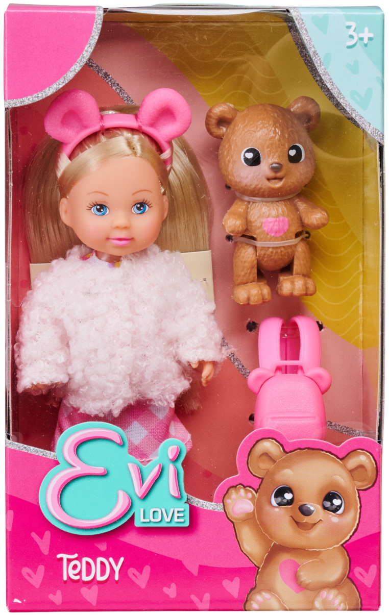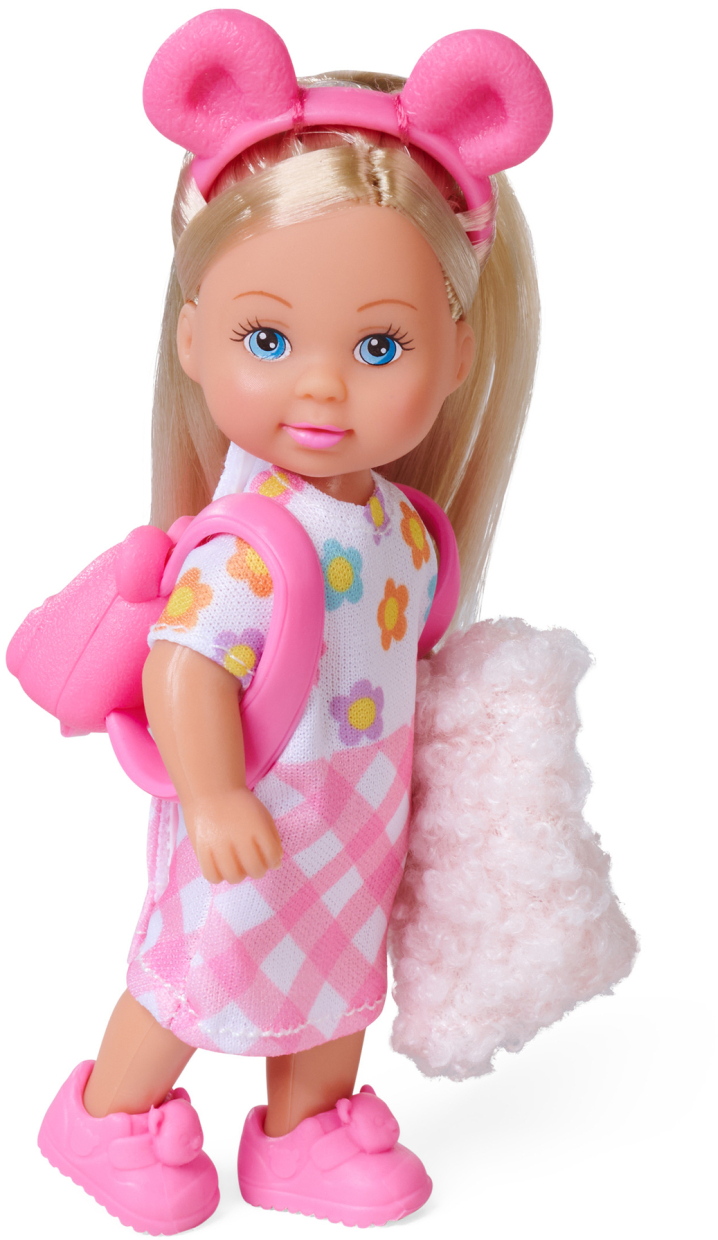 Evi mit einer flauschigen Jacke, mit Bärenhaarreif,-schuhen, -rucksack, und Teddy