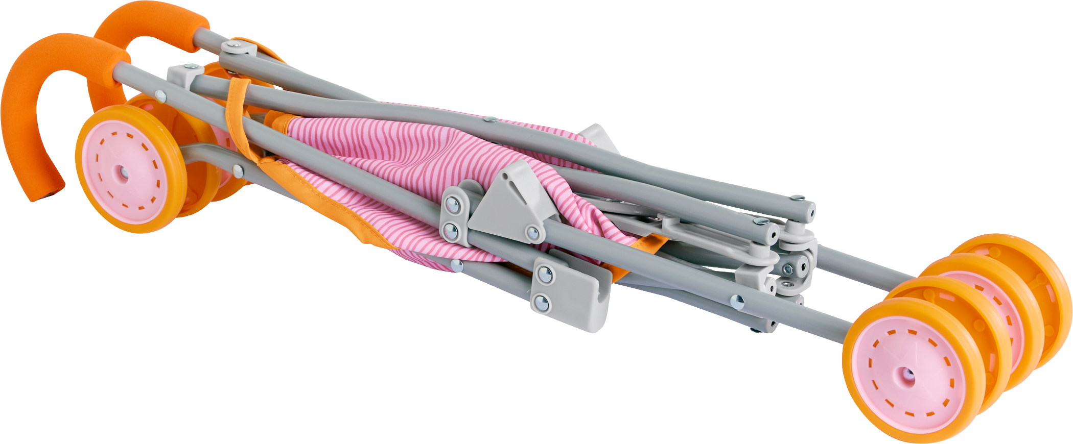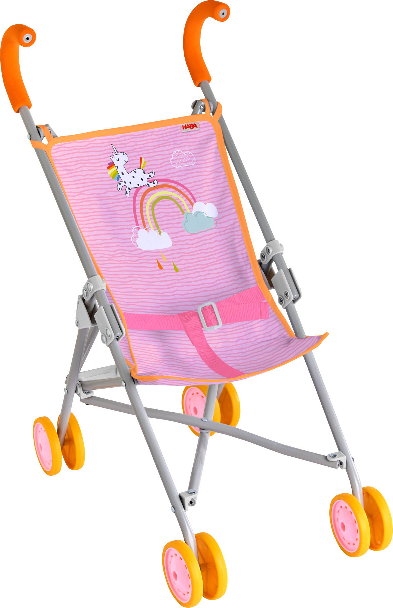 Der Buggy Regenbogen lädt Puppeneltern zu entspannten Ausfahrten ein. Dank verstellbarem Gurt können Puppenkind und Kuscheltier sicher angeschnallt werden, während die leichtgängigen Doppelräder für komfortables Schieben sorgen. Gepolsterte Griffe bieten zusätzlichen Halt. Die stabile Konstruktion aus leichten Metallrohren lässt sich mit wenigen Handgriffen schmal zusammenklappen – perfekt zum Mitnehmen.