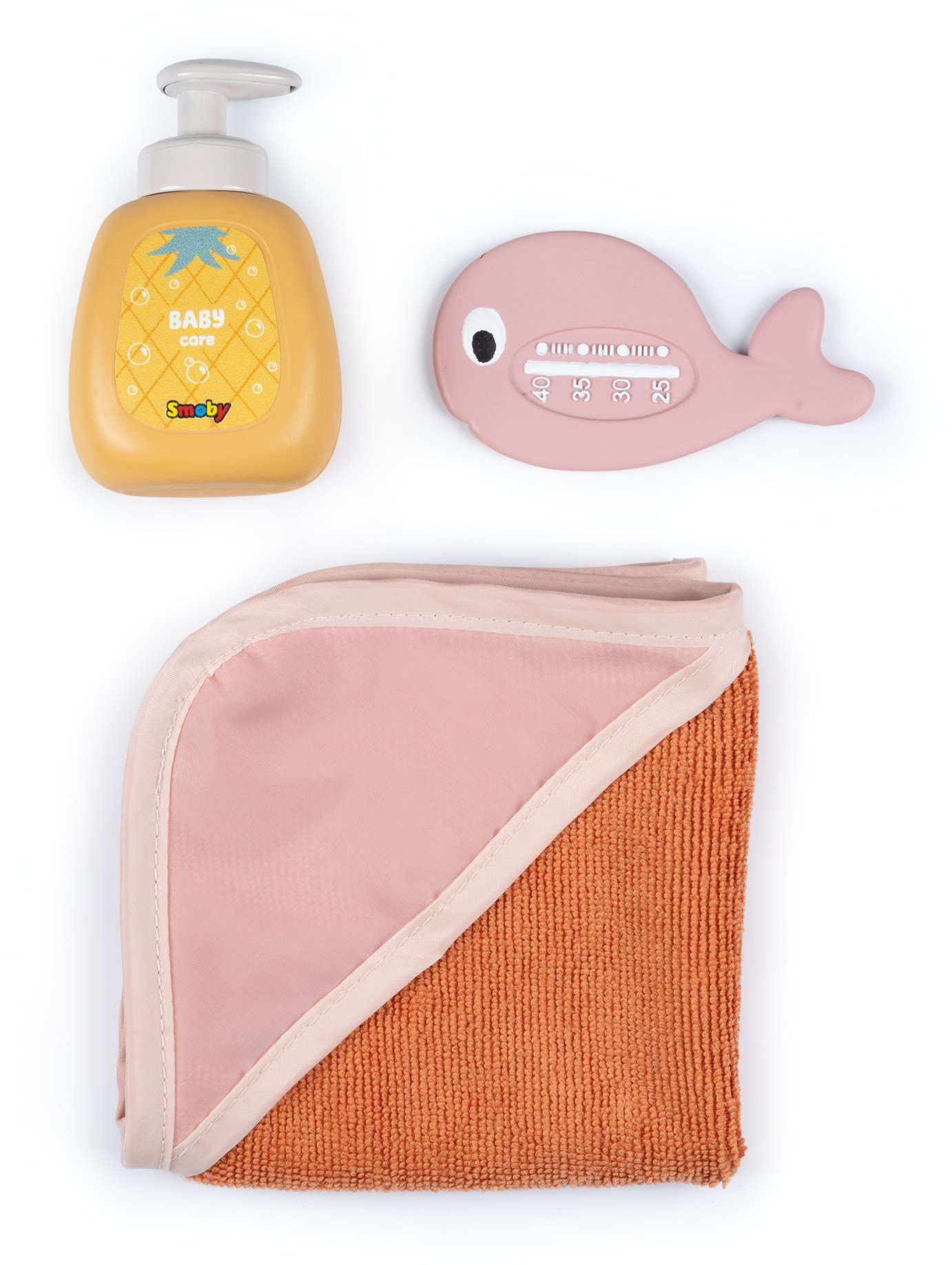 Die Kopfstütze sorgt auch bei längeren Badesessions dafür, dass dein kleiner Schatz komfortabel liegt. Die Ablagefläche bietet genug Platz, um die mitgelieferten Zubehörteile zu verstauen: Badetuch aus Baumwoll-Frottee, eine Shampooflasche mit Pumpfunktion und ein Wal-Thermometer. Das Thermometer ist wärmeempfindlich, bei Kontakt mit Wasser ändert es seine Farbe.