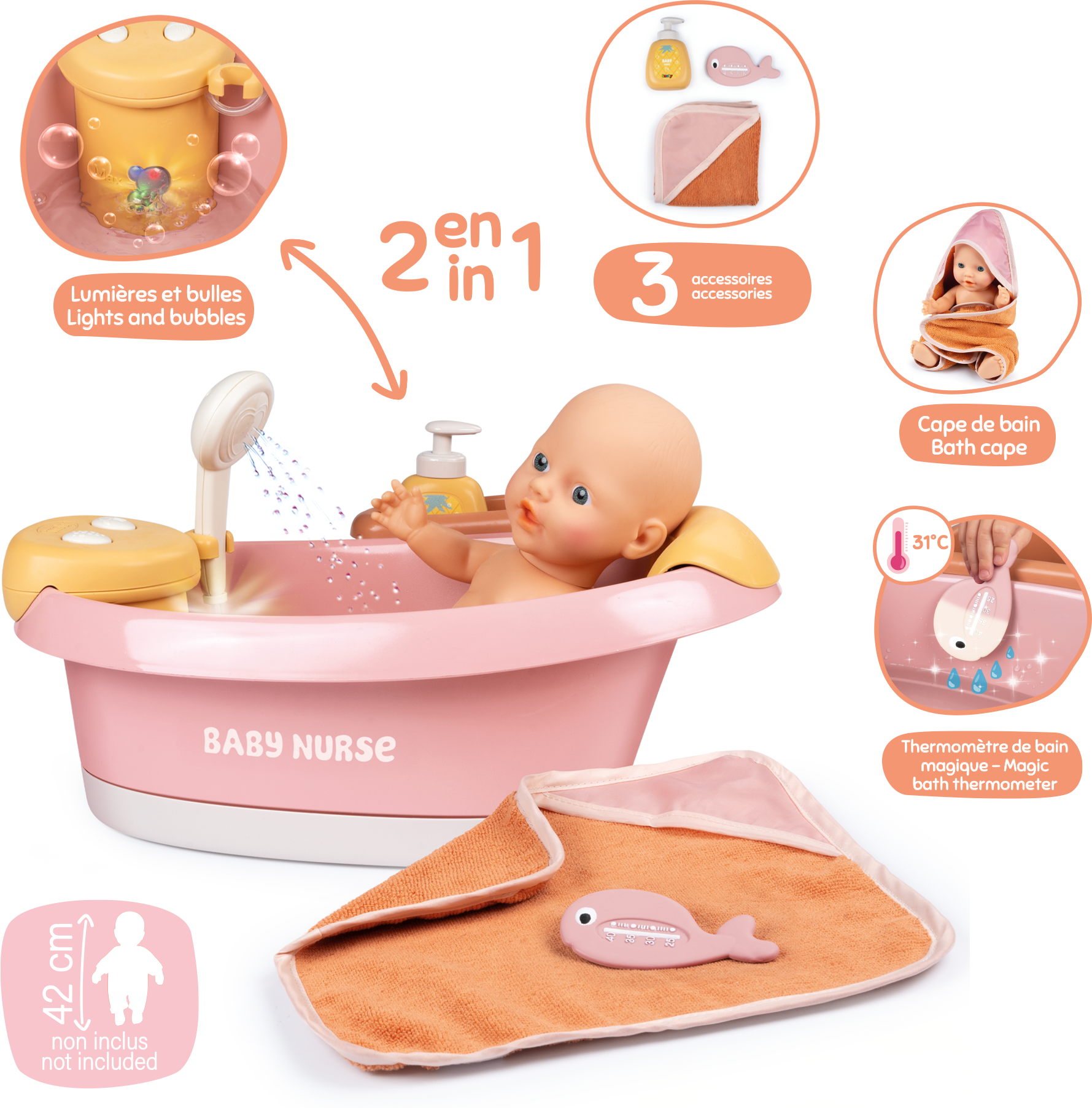 In der Smoby Baby Nurse Puppenbadewanne fühlen sich alle Lieblingspuppen pudelwohl! Denn während sie ein schönes, warmes Bad nehmen, steigen Blubberblasen nach oben und ein toller Lichteffekt mit verschiedenen Farben sorgt für Abwechslung. Nach dem Waschen können sie schnell abgebraust werden, denn aus dem automatischen Duschkopf fließt per Knopfdruck echtes Wasser.