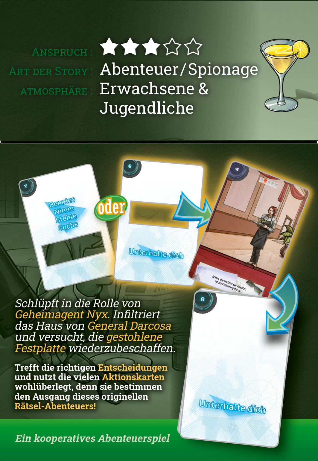 'Die Smaragd-Hochzeit': Agent Nyx ist auf die Suche nach einer gefährlichen Festplatte. Diese ist im Besitz von General Darcosa, einem skrupellosen Verbrecher. Um sie ihm zu entwenden, begibt er sich in sein Domizil