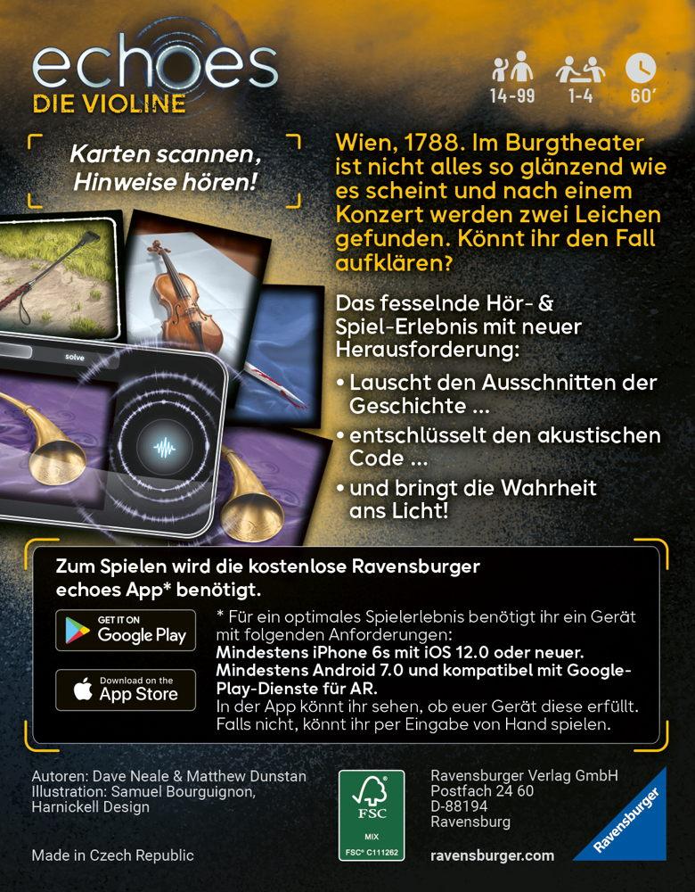 Wien, 1788. Im Burgtheater ist nicht alles so glänzend wie es scheint und geheime Informationen werden unerkannt weitergegeben. Kommen die Spieler dem Verräter auf die Spur? echoes ist ein einzigartiges, kooperatives Audio Mystery Spiel. Die Spieler hören mithilfe der kostenlosen Ravensburger echoes App mysteriöse Geräusche und Stimmen, die mit den Kartenmotiven verbunden sind. Gemeinsam bringen sie die 24 Teile der Geschichte in die richtige Reihenfolge, um den Fall zu lösen.Die kostenlose Ravensburger echoes App wird zum Spielen benötigt. Im Lauschen-Modus der App können die Spieler die Sounds abspielen. Im Lösen-Modus überprüfen die Spieler jeweils vier Karten auf ihre Reihenfolge, um Kapitel für Kapitel zu lösen. Zum Schluss müssen die Spieler die gesamte Geschichte in die richtige Reihenfolge bringen, um den Fall zu lösen.Für ein optimales Spielerlebnis mit Kamera-Erkennung wird ein Gerät mit folgenden Anforderungen benötigt: Mindestens iPhone 6s mit iOS 12.0 oder neuer / Android-Gerät mit mindestens Android 7.0 und kompatibel mit den Google-Play-Diensten für AR (Diese können auf manchen Geräten nachträglich installiert werden). Falls das Gerät diese nicht erfüllt, kann per manueller Eingabe gespielt werden.