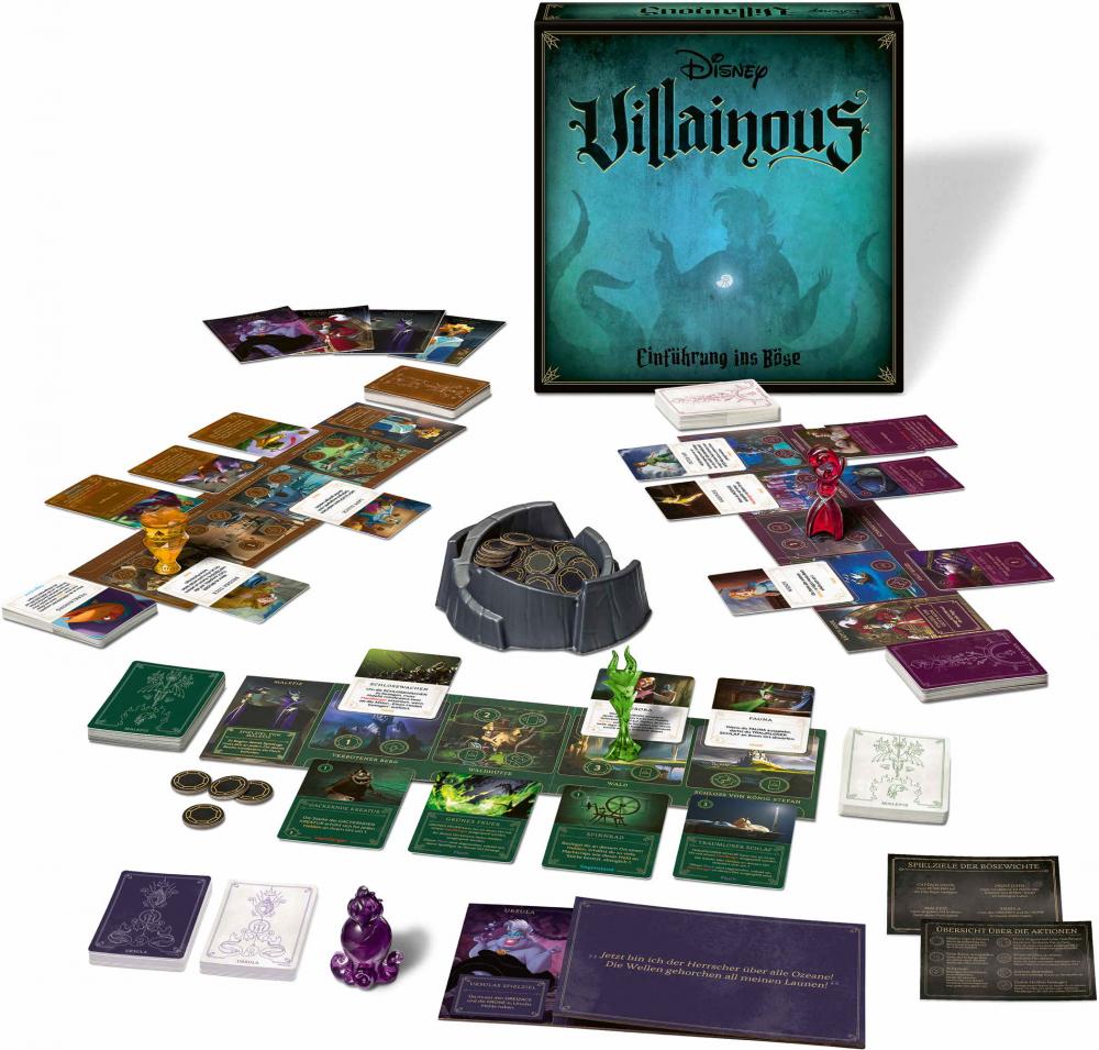 Deutsche Ausgabe der vereinfachten Disney Villainous-Variante mit den Disney-Bösewichten Ursula, Malefiz, Käpt'n Hook und Prinz John