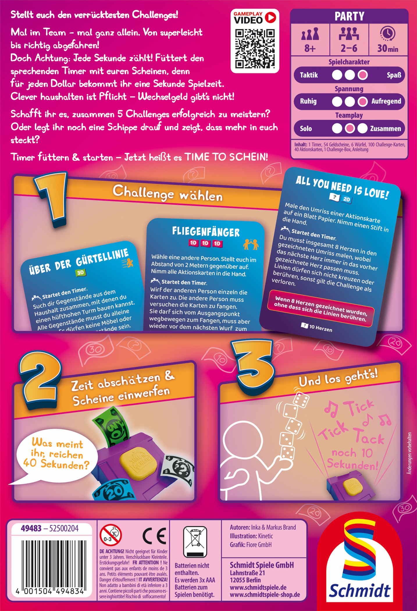 Stellt euch den verrücktesten Challenges!Mal im Team - mal ganz allein. Von superleicht bis richtig abgefahren! Doch Achtung: Jede Sekunde zählt! Füttert den sprechenden Timer mit euren Scheinen, denn für jeden Dollar bekommt ihr eine Sekunde Spielzeit. Clever haushalten ist Pflicht – Wechselgeld gibt’s nicht! Schafft ihr es, zusammen 5 Challenges erfolgreich zu meistern? Oder legt ihr noch eine Schippe drauf und zeigt, dass mehr in euch steckt? Timer füttern und starten – Jetzt heißt es TIME TO SCHEIN!
