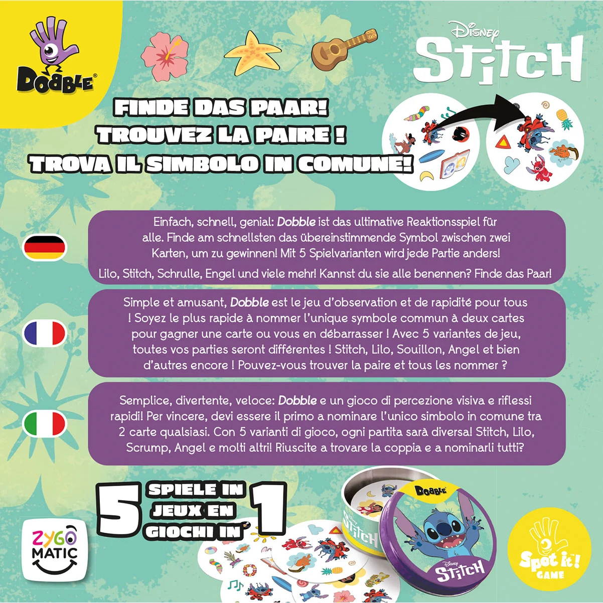 Dobble Disney Stitch bietet fünf Spielvarianten, bei denen es um Geschwindigkeit geht und alle Spieler gleichzeitig gefordert sind. Das Ziel besteht immer darin, als Erster das Symbol zu finden, das auf zwei Karten übereinstimmt, und es dann laut zu benennen.