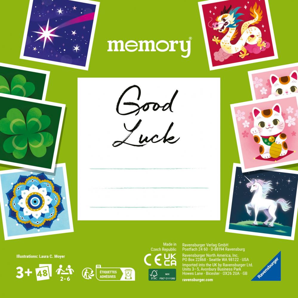 Das memory® moments Good luck zeigt auf 48 liebevoll illustrierten Karten 24 Glücksbringer und Glückssymbole aus aller Welt. Neben dem Kleeblatt, dem Hufeisen und dem Marienkäfer stehen auch die winkende Katze, Koi-Fische oder Mandalas für Glück und Freude. Ebenso bringt der Elefant Glück, jedoch muss er sein Rüssel nach oben halten, damit das Glück nicht herausfällt. Immer zwei bildgleiche Karten werden gesucht. Wer die meisten Paare findet, gewinnt am Ende das Spiel.