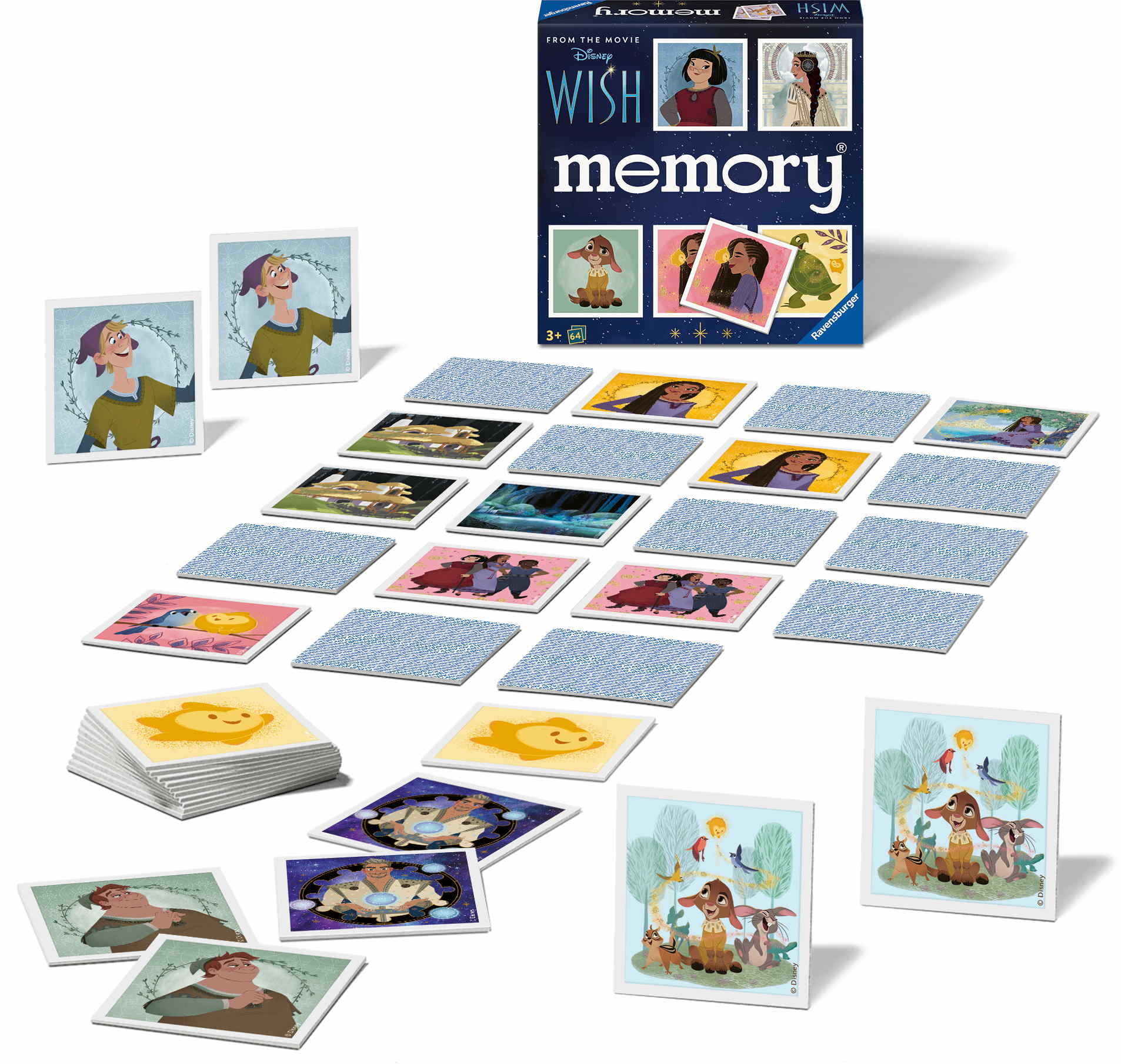 In diesem memory® entdecken bis zu 8 Spieler ihre Lieblingsfiguren aus dem Film Disney Wish und machen sich auf die Suche nach gleichen Bildern mit Asha, Valentino, Star und einigen anderen Charakteren. Gewonnen hat, wer die meisten Kartenpaare gesammelt hat