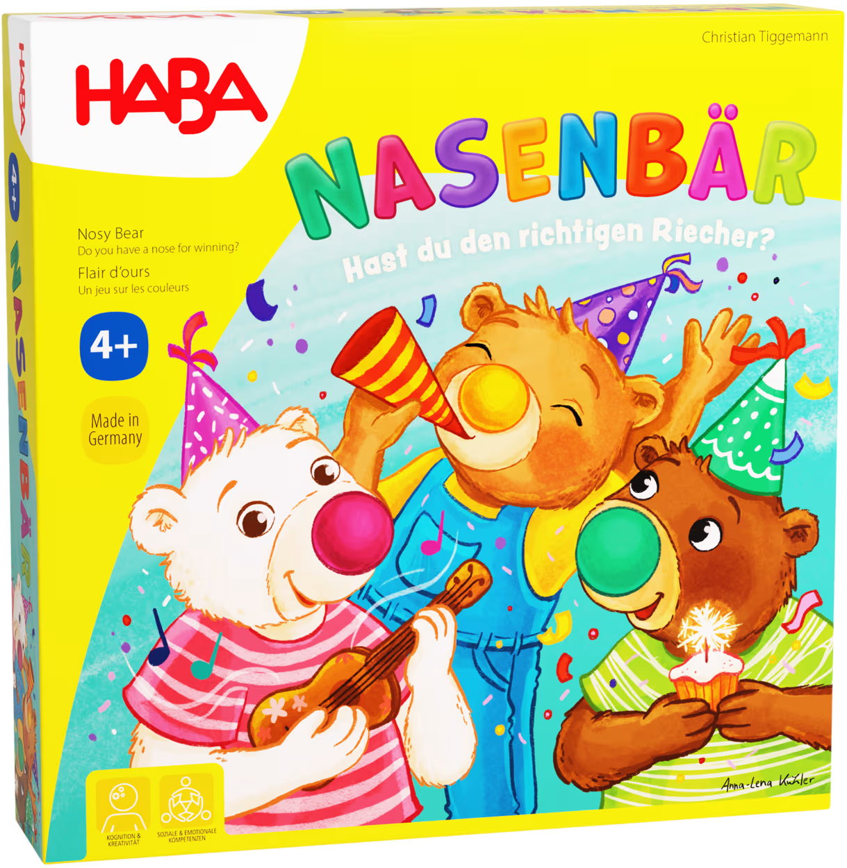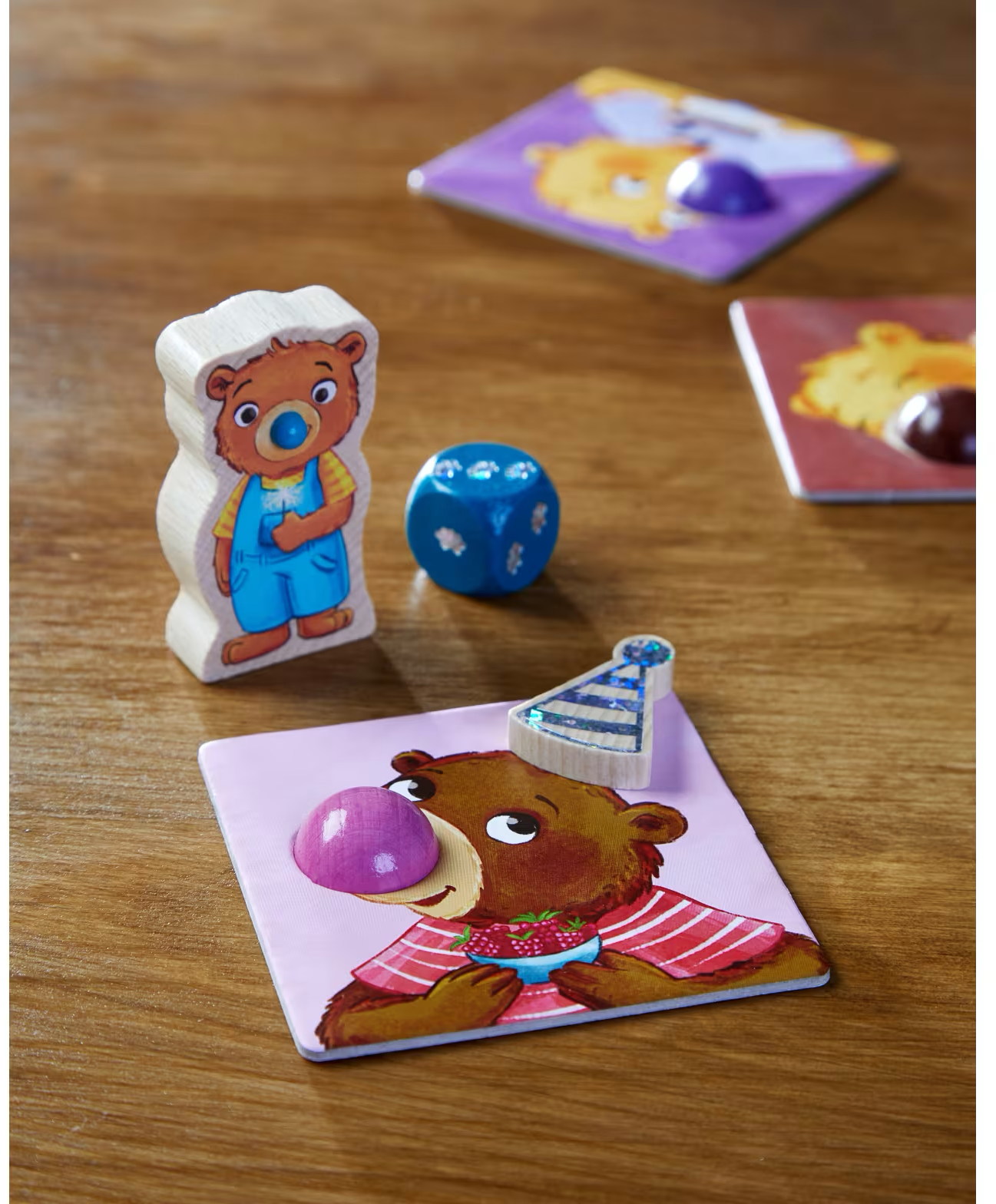 Yuki Nasenbär hat viele bunte Bären zu einer großen Party eingeladen! Erdbär, Blaubär und der pinke Himbär sind schon da. Wer mit Würfelglück und etwas Taktik alle eigenen Bärenkarten über die farblich passenden Nasen der bunten Bären ablegt, gewinnt.