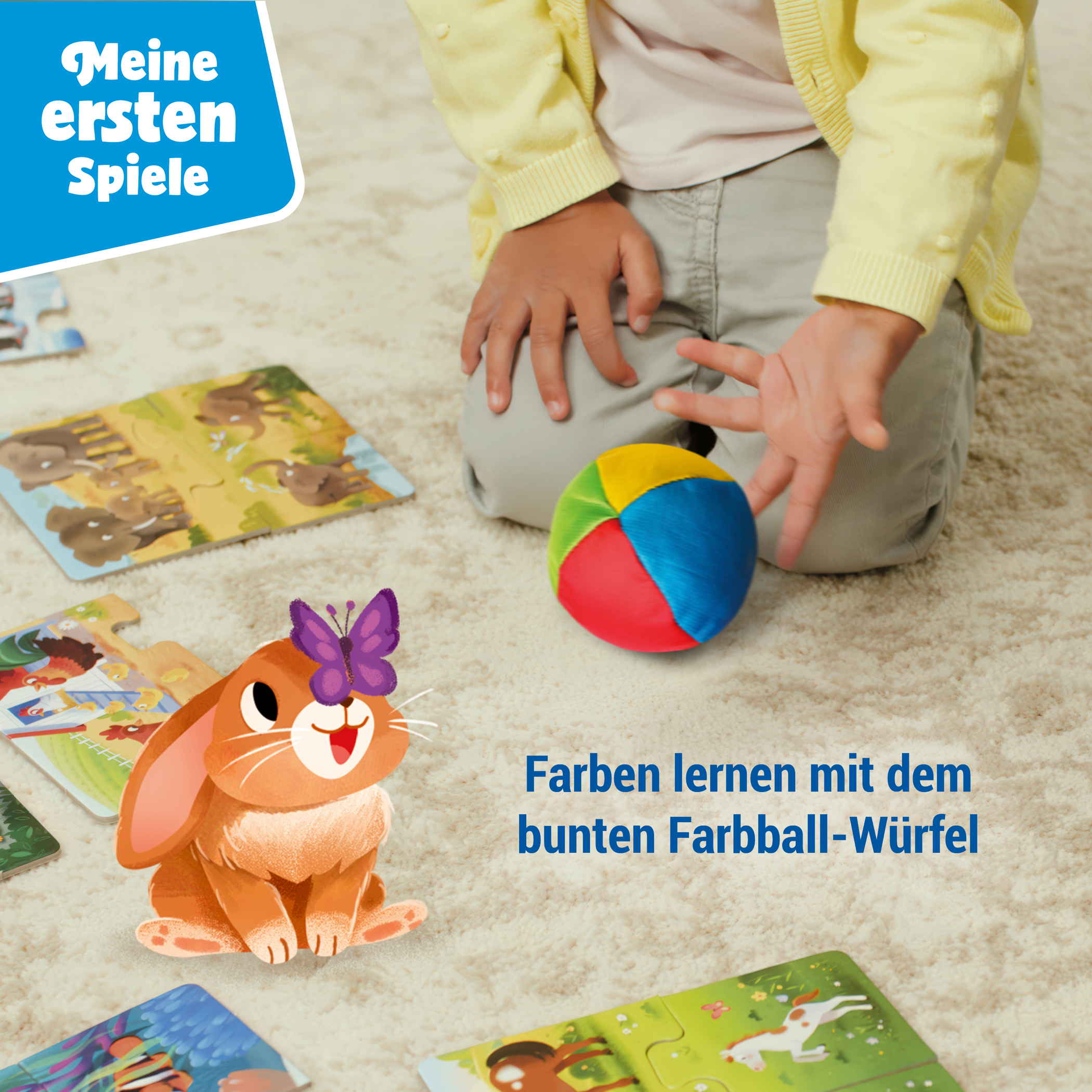 Farben lernen: Der bunte Farb-Ball zum Werfen bestimmt die Farbe der nächsten Tierkarte und macht das Spiel zu etwas Besonderem. So lernen die Kinder die Farben kennen, und es kommt viel Bewegung ins Spiel