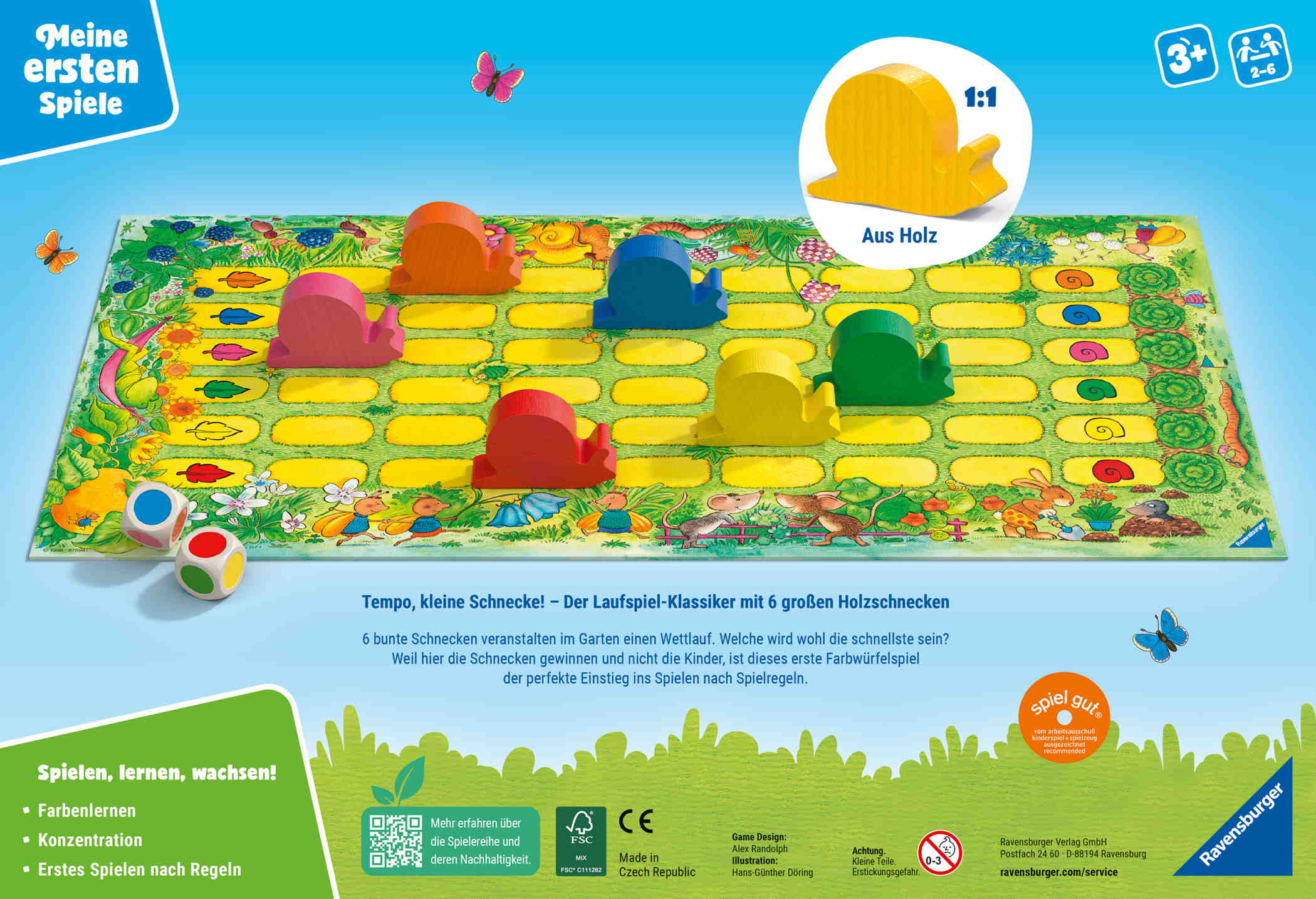 - Beliebter Klassiker: Seit 1985 fördert das lustige Schneckenrennen das Erkennen von Farben, die Konzentration sowie erstes Regelverständnis. So unterstützt dieses Würfelspiel spielerisch die Entwicklung von Kindern ab 3 Jahren