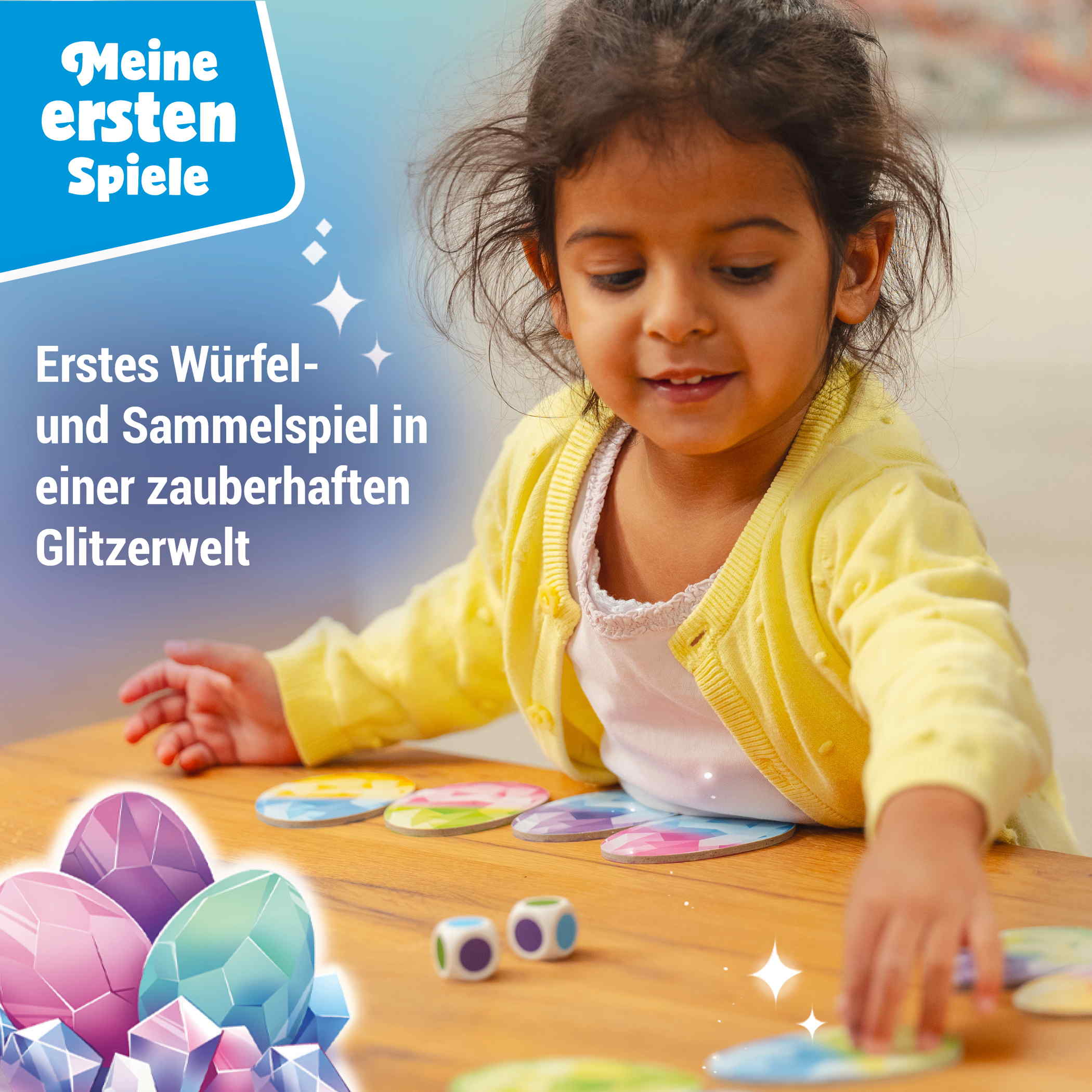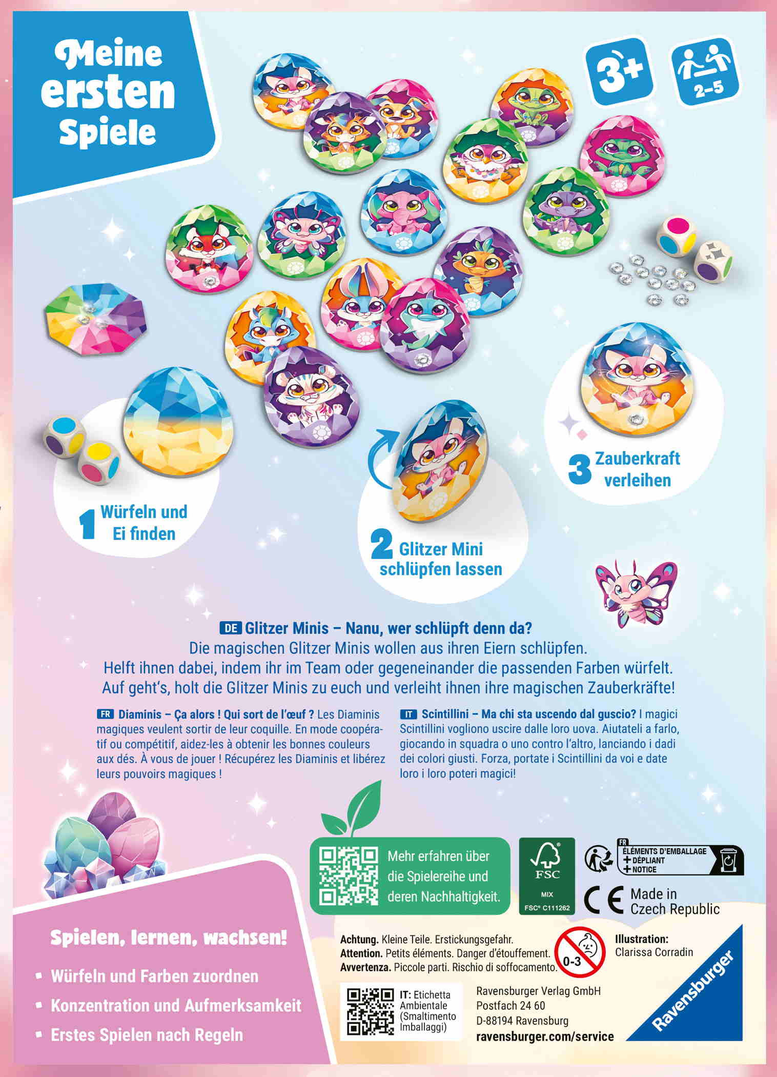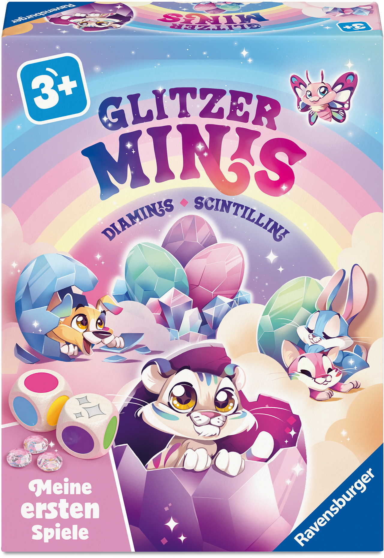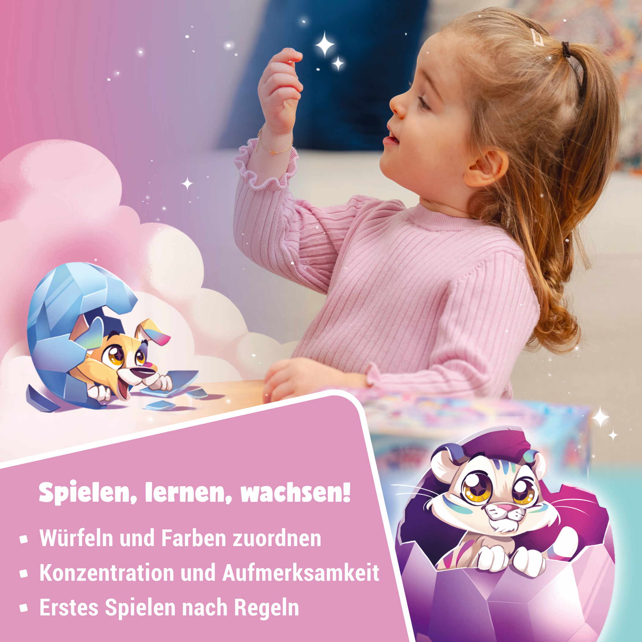 Erstes Würfelspiel: Wer an der Reihe ist würfelt mit beiden Farbwürfeln und nimmt das entsprechende Glitzer-Ei zu sich. Pass auf, dass es dir nicht geklaut wird, bevor das Glitzer Mini schlüpfen kann.