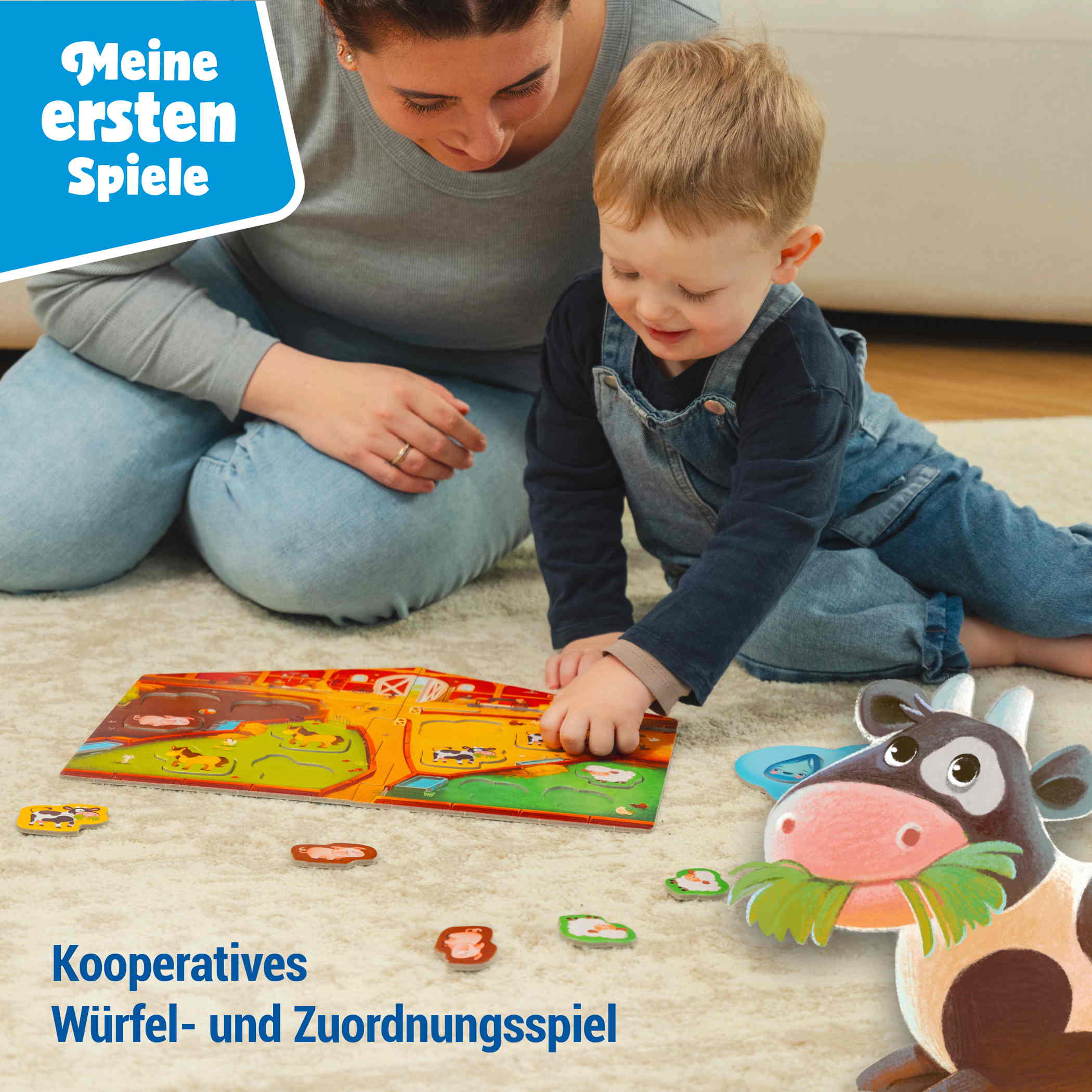 Alle spielen zusammen: Gemeinsam bringen die Kinder die Tiere in den Stall, bevor die Regenwolke voll Tropfen ist. Der Holzwürfel entscheidet, welches Tier als nächstes eingepuzzelt wird. Das kooperative Spielziel stärkt das Gefühl von Gemeinschaft