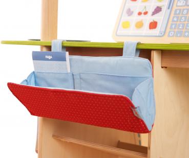 Ein eigenes Kassenfach aus Stoff mit Stift und Notizblock bietet den kleinen Verkäufern Platz für Münzen und Geldscheine