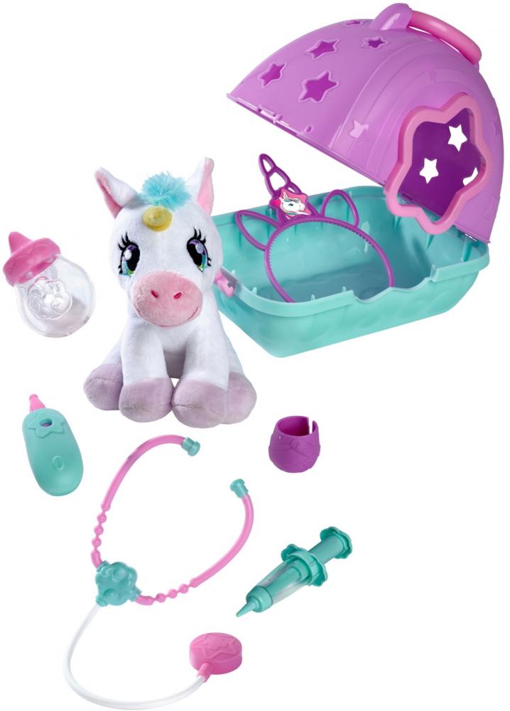 Das süße Plüscheinhorn mit blauem Schweif kann von den Kindern verarztet werden und kommt in einem 23x20cm Koffer mit allerlei Doktorzubehör. Man kann es mit dem Fläschchen füttern, mit dem Stethoskop abhören, die Temperatur messen oder ihm eine Spritze geben. In der Transportbox lässt sich das 20cm große Einhorn bequem überallhin transportieren. Für die Kinder ist im Set außerdem ein Einhorn Haarreifen enthalten. Der Doktorkoffer mit Plüscheinhorn von Simba Toys ist für Kinder ab 3 Jahren geeignet.