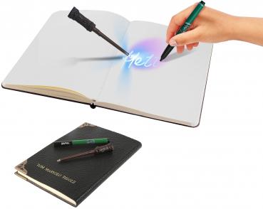 Zum Set gehört ein Blanko-Tagebuch im Film-Look, das jeder Fan selbst füllen kann. Dabei schreibt er mit unsichtbarer Tinte, die erst unter UV-Licht wieder sichtbar wird. Stift und UV-Lampe im Zauberstab-Design sind bereits enthalten.