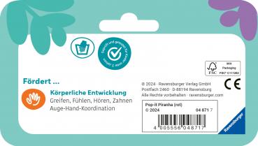 Dieser Kuschel-Piranha mit klapperndem Fischbaby kommt ganz friedlich angeschwommen. Flossen zum Greifen, eine bunte Rassel und verschiedene Materialien stimulieren die Sinne und fördern die Feinmotorik und Wahrnehmung von Babys. Der Fischschwanz aus 100% Silikon mit strukturierter Oberfläche hilft den Kleinen, wenn die ersten Zähne kommen und bietet dank lustiger Pop-its auch darüber hinaus viel Spaß. Mit praktischem Clip zum einfachen Befestigen an Babyschale und Kinderwagen.