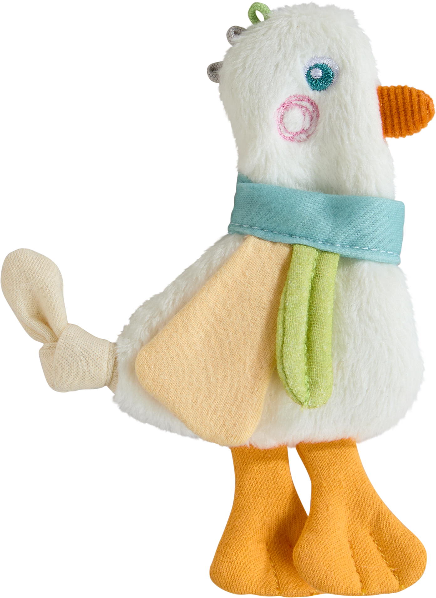 Die Gans Rasselgreifling vereint zeitlose Eleganz mit liebevoller Verspieltheit und lädt Babys ab 0 Jahren dazu ein, die Welt mit Neugier zu erkunden. Die sanften Farben, das harmonische Rasselgeräusch und das niedliche Design ziehen die Aufmerksamkeit auf sich und regen zum Fühlen und Greifen an, was die kognitiven Fähigkeiten fördert. Ein besonderes Detail ist der weiche Schwanz, der als Nuckelknoten dient und beruhigend wirken kann. Perfekt, um kleine Entdecker auf dem Wickeltisch und in anderen Momenten abzulenken und zu beruhigen.