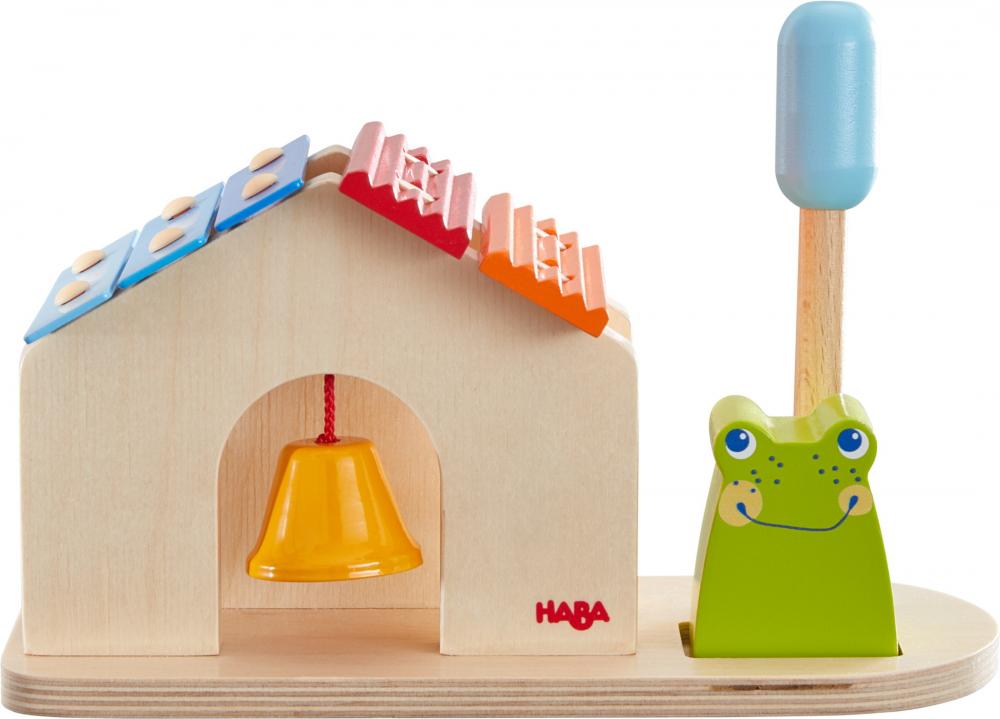 Hereinspaziert und ausprobiert! Im HABA Metallophon Klanghaus entdecken Kinder ab 1 Jahr Klangwelten und Kreativität. Das farbenfrohe Holzhaus ist gedeckt mit einem Xylophon und Ratter-Platten. Wenn Kleinkinder den handlichen Schlägel darüber tanzen lassen, erzeugen sie erste Tonfolgen und Rhythmen. Der lustige grüne Frosch lädt zum Rasseln ein. In dem kleinen Haus hängt eine glänzende Glocke, die mit hellem Klang begeistert. Das robuste Instrument für Kleinkinder fördert die Feinmotorik und vermittelt Rhythmusgefühl mit riesen Spielvergnügen.
