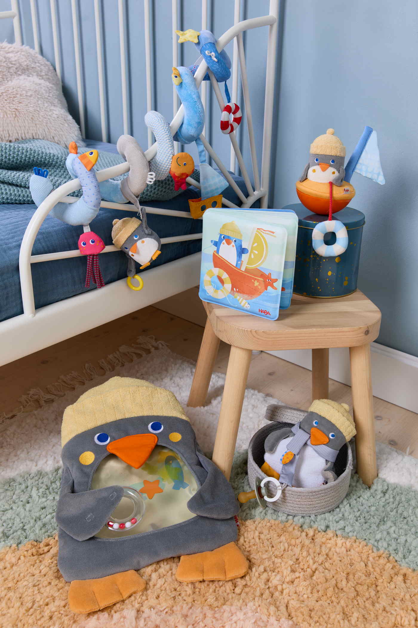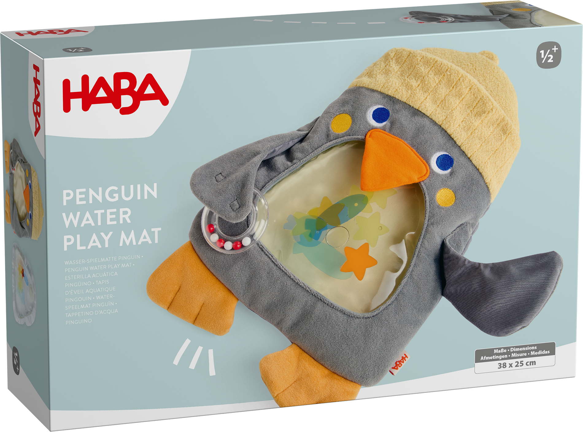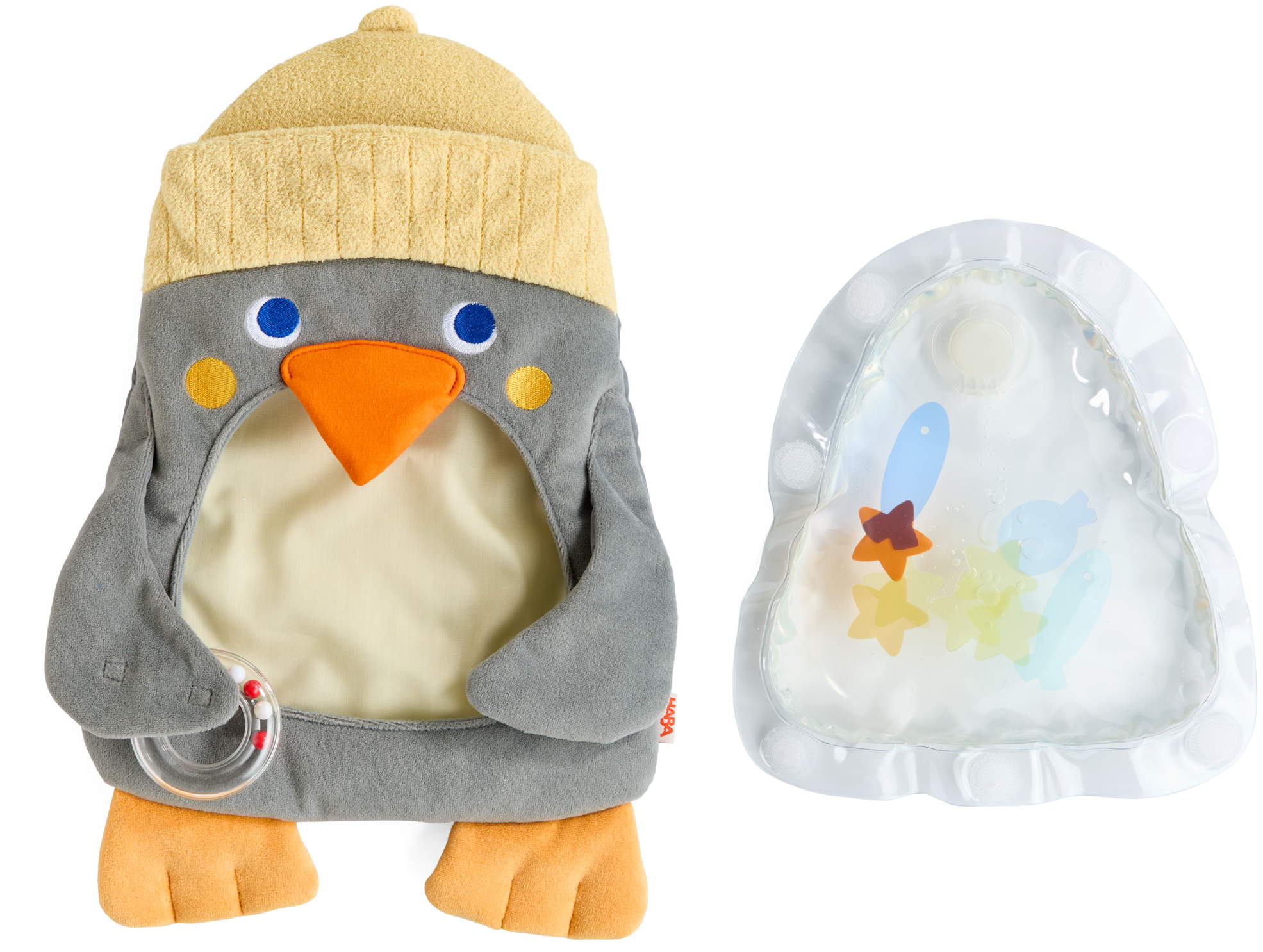 Plitsch, platsch – Badetag mit dem kleinen Pinguin Piet! Auf der HABA Wasserspielmatte Pinguin liegen Babys ganz weich und bequem. Durch ein großes Guckfenster im Pinguinbauch gibt es farbenfrohe Formen zu sehen. Kleine Fische und Sterne schwimmen vorbei. Schon mit leichtem Druck können Babys die Spielelemente bewegen. Die mit Wasser gefüllte Spielmatte steckt in einer weichen Stoffhülle in Pinguin-Form mit flauschiger Mütze. Wenn es so viel auszuprobieren und zu staunen gibt, trainieren die Kleinen ihre Motorik in Bauchlage und ihre Wahrnehmung mit riesen Spaß. Einfach mit Wasser befüllen und schon kann es losgehen! Die Wassermenge kann je nach gewünschtem Spieleffekt variiert werden. Mit Sicherheitsventil.