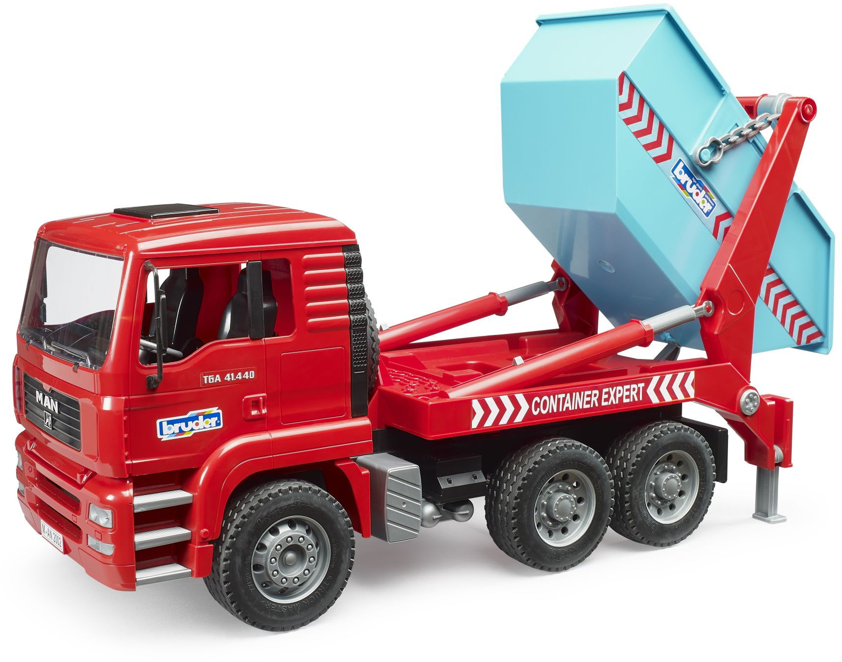 Für unsere kleinen Baumeister, gibt es den MAN TGA Absetzcontainer in modernen Farben als weiteres Fahrzeug in der Themenwelt Nutzfahrzeuge. Mit einem Handgriff kann der Container auf- und abgeladen werden. Entfernt man die Ketten, so kann der Container stehen bleiben und der LKW ist für andere Fahrten frei. Für eine bessere Stabilität beim Auf- und Abladen können Stützen am LKW ausgefahren werden.