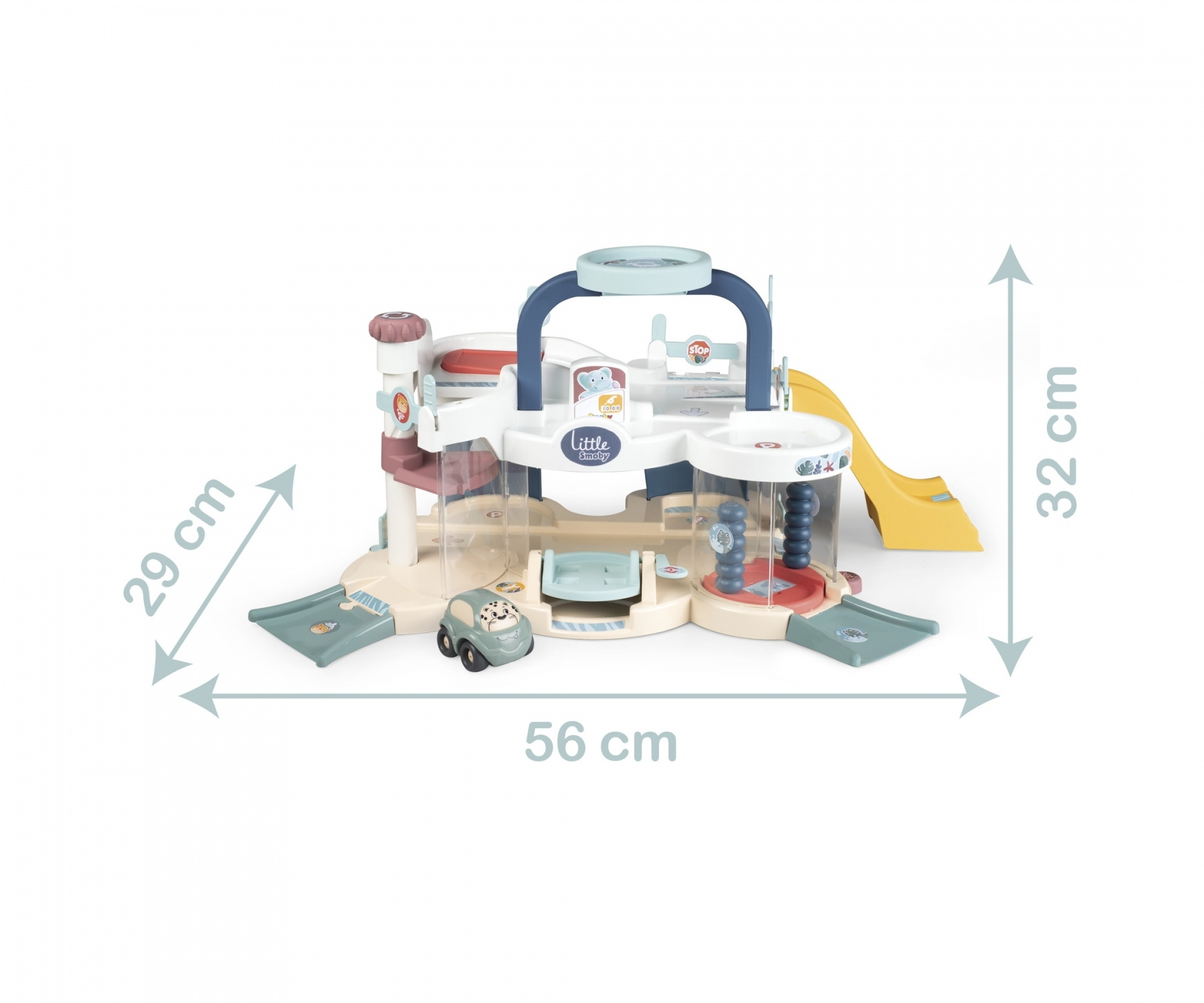 In der Little Smoby Multi-Garage gibt es für Kinder ab 18 Monaten eine Menge zu entdecken. Das besondere Spielset für kleine Autofans lädt auf drei Ebenen zum Entdecken und Erfahren ein. Der große, drehbare Lastenaufzug bringt die kleinen Fahrzeuge schnell auf das Parkdeck. Dort können die Mini-Flitzer auf dem Parkplatz etwas ausruhen oder über die große Fahrrampe wieder hinunterfahren. Soll es schneller gehen, sorgt die Absprungrampe für den nötigen Schwung. Bewegliche Schranken zeigen den kleinen Mini-Flitzern, wo die Durchfahrt verboten ist, denn die Fahrrampe kann an zwei verschiedenen Stellen angebracht werden. Über dem Parkdeck befindet sich der Hubschrauberlandeplatz, auf dem der kleine Mini-Flitzer Hubschrauber startet und landet. Im unteren Bereich der Multi-Garage mit Werkstatt und Waschstraße ist für die Pflege und Instandhaltung der Mini-Flitzer bestens gesorgt. Breite Fahrrampen und Schranken sorgen für einen geregelten Ablauf. Im Set enthalten sind ein Mini-Flitzer Auto