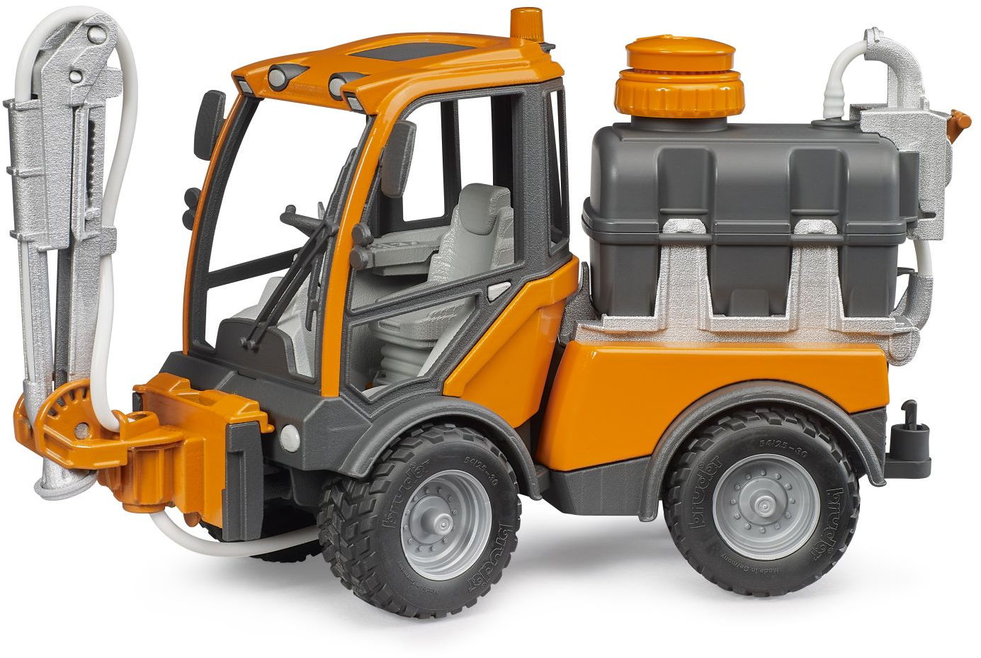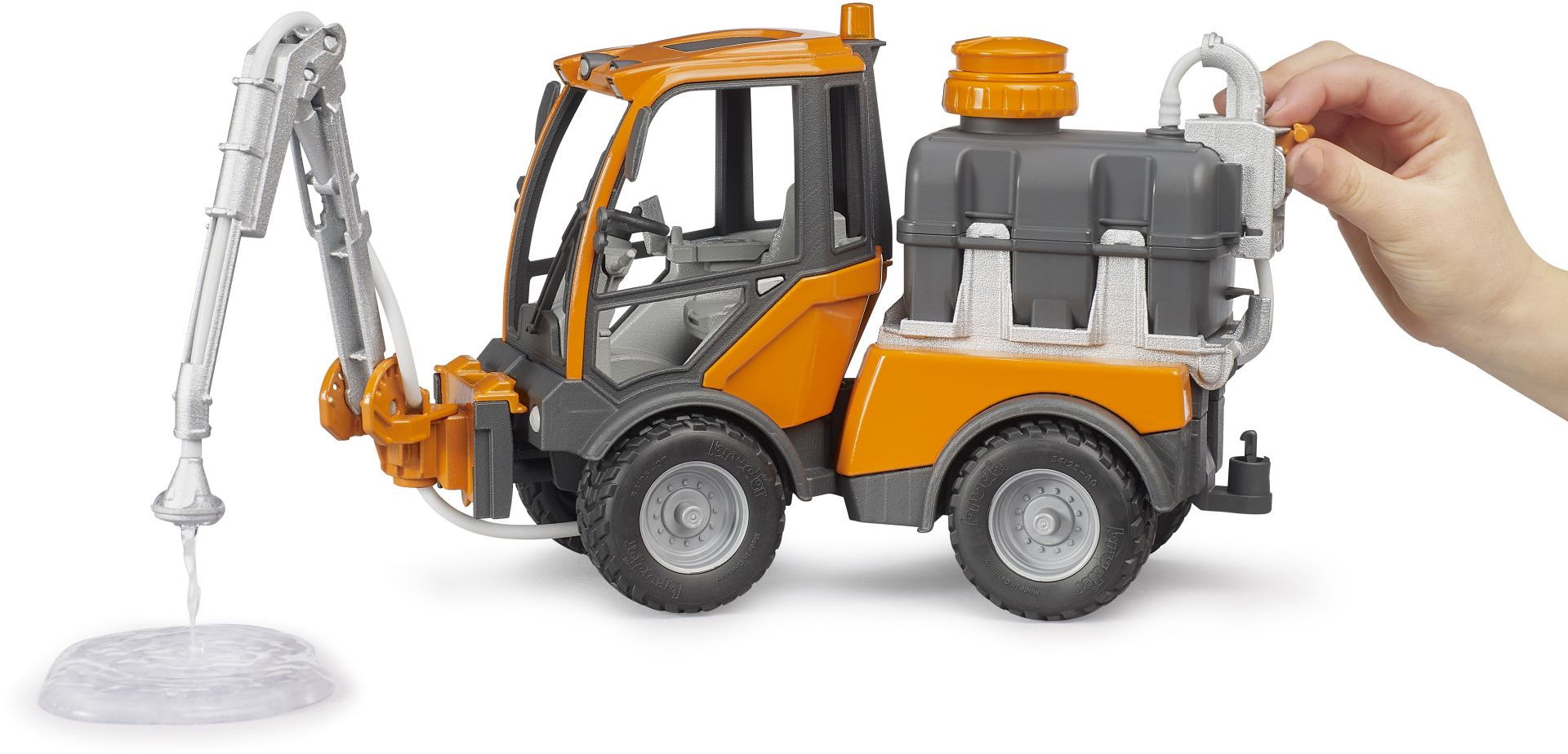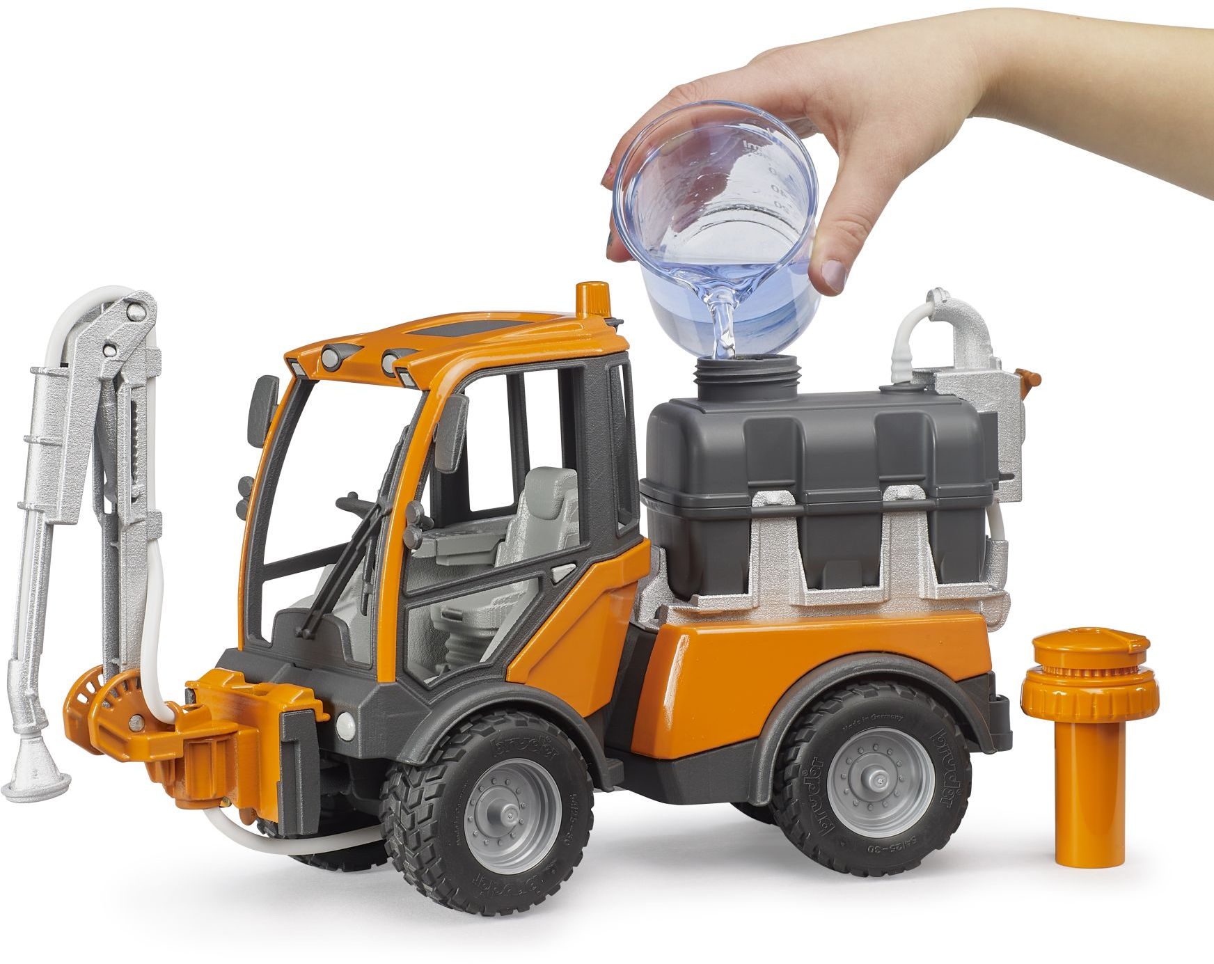 Mit dem BRUDER VarioCar können Kinder spielerisch im eigenen Gartnen lernen, wie eine effiziente Bewässerung für Grünflächen und Parkanlagen in den Sommermonaten funktioniert. Dafür ist das VarioCar mit einem befüllbaren Tank mit Pumpe am Heck ausgerüstet. Über ein Schlauchsystem wird Wasser an den, in der Seite und Höhe anpassbaren Beregnungsarm geleitet. Noch kurz den Hebel am Tank umlegen und das Wasser wird an die Pflanzen verteilt.